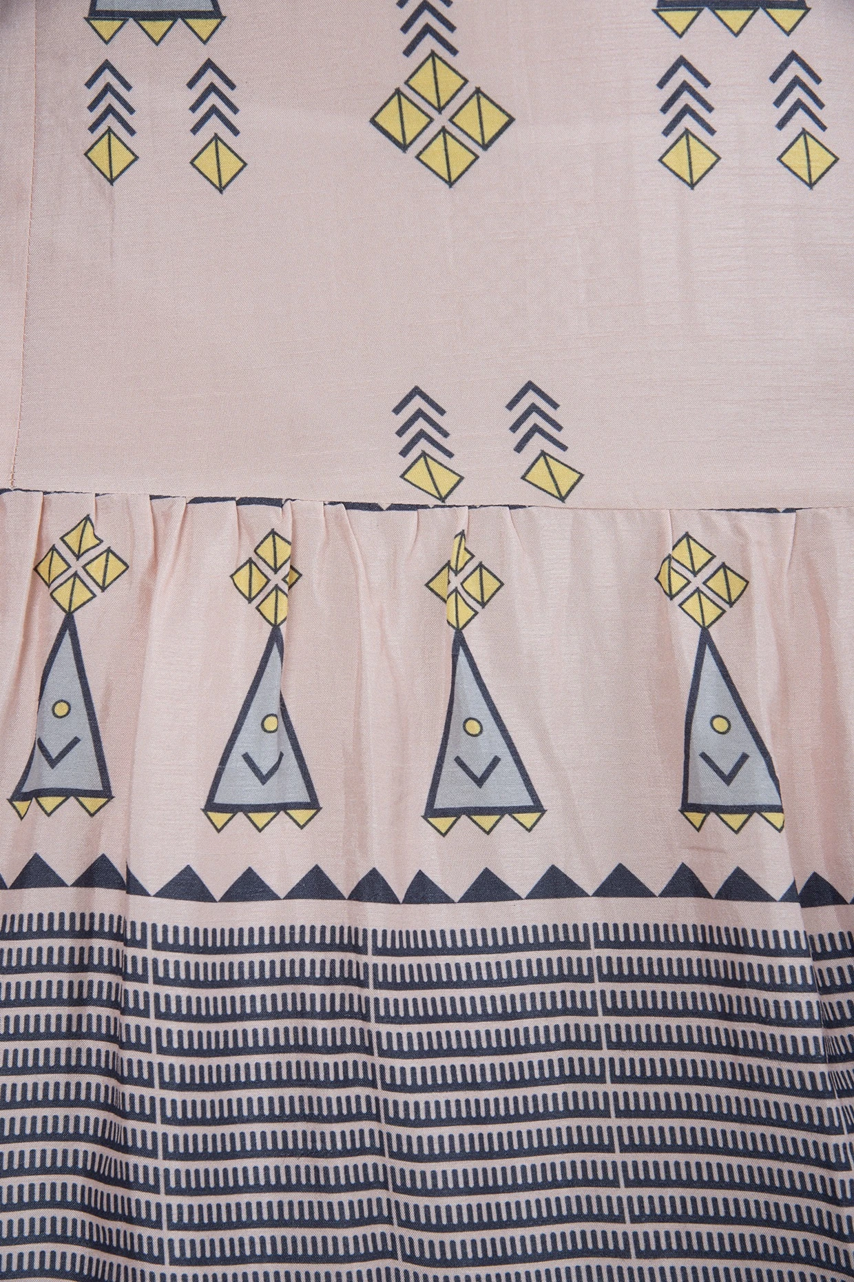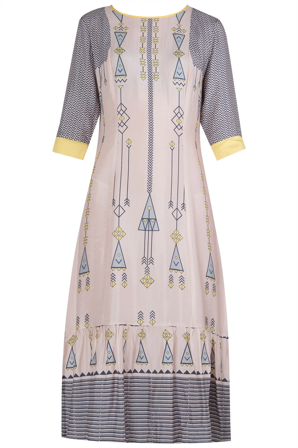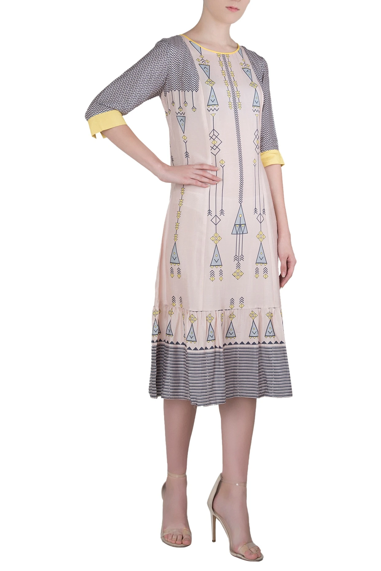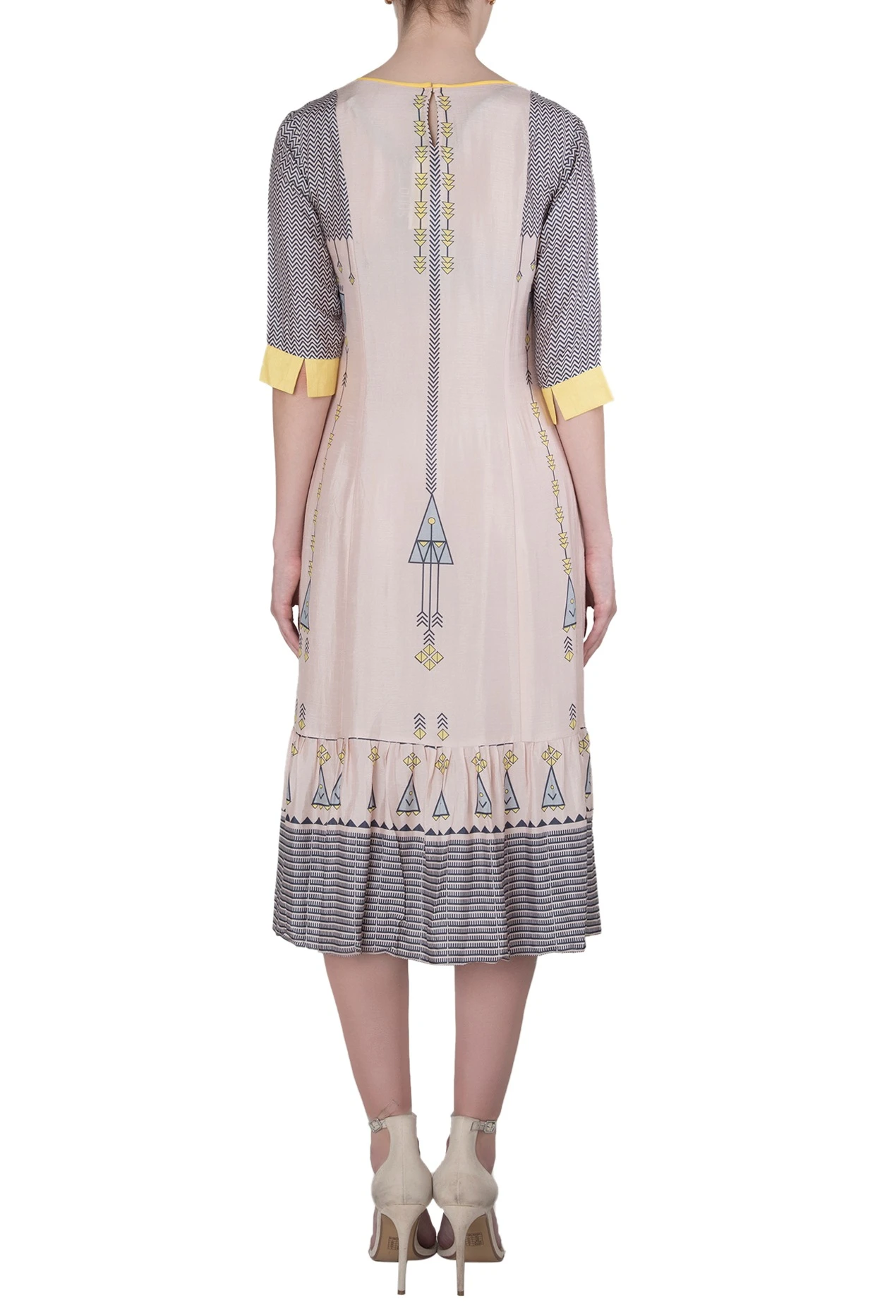 Featuring a pink and blue knee length dress in silk base enhanced with print all over.