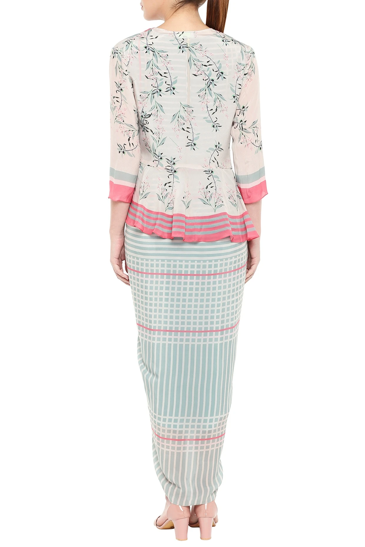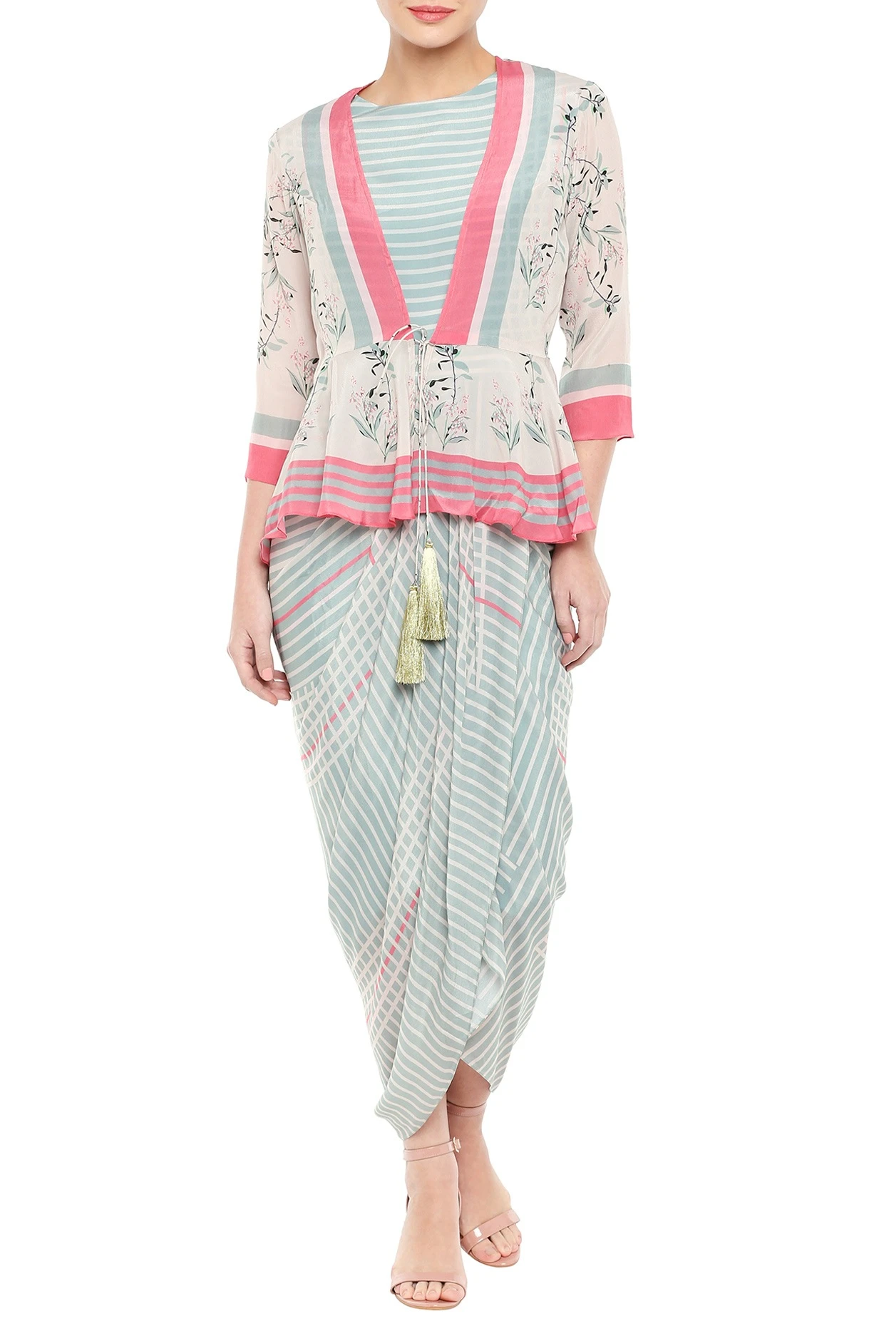 Featuring a pink and blue drape dress in crepe base with print. It is paired with a matching peplum jacket.