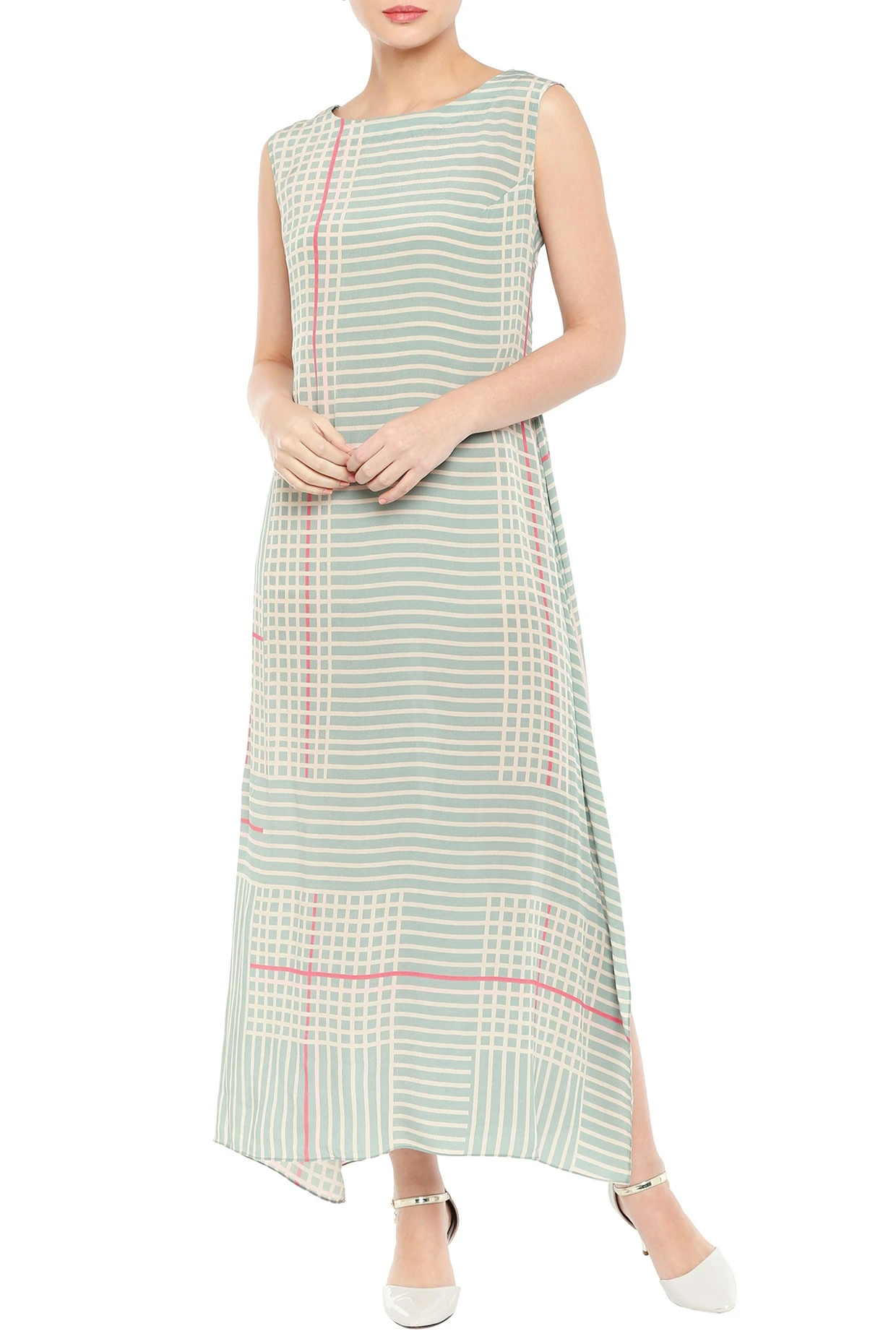 Featuring a pink and blue dress in crepe base with print. It is paired with a matching jacket.
