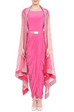 Featuring a pink draped dress in crepe base. It is paired with matching cape in net base having hand embroidery and metal belt.