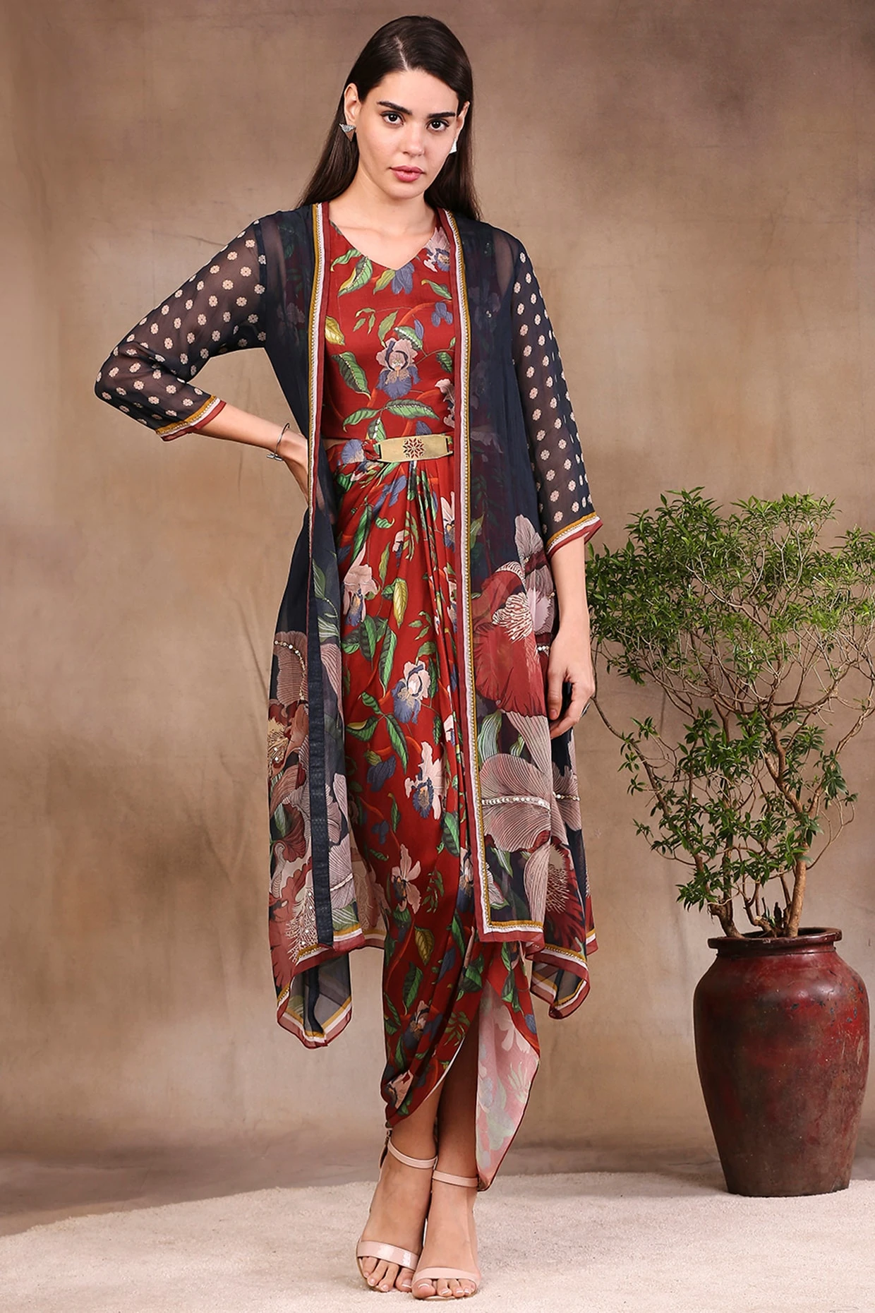 Featuring a red draped dress in organza base with print and embroidery. It is paired with a contrasting straight jacket in satin base having print.