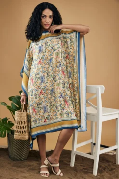 Featuring a yellow kaftan dress in cotton silk base with print.