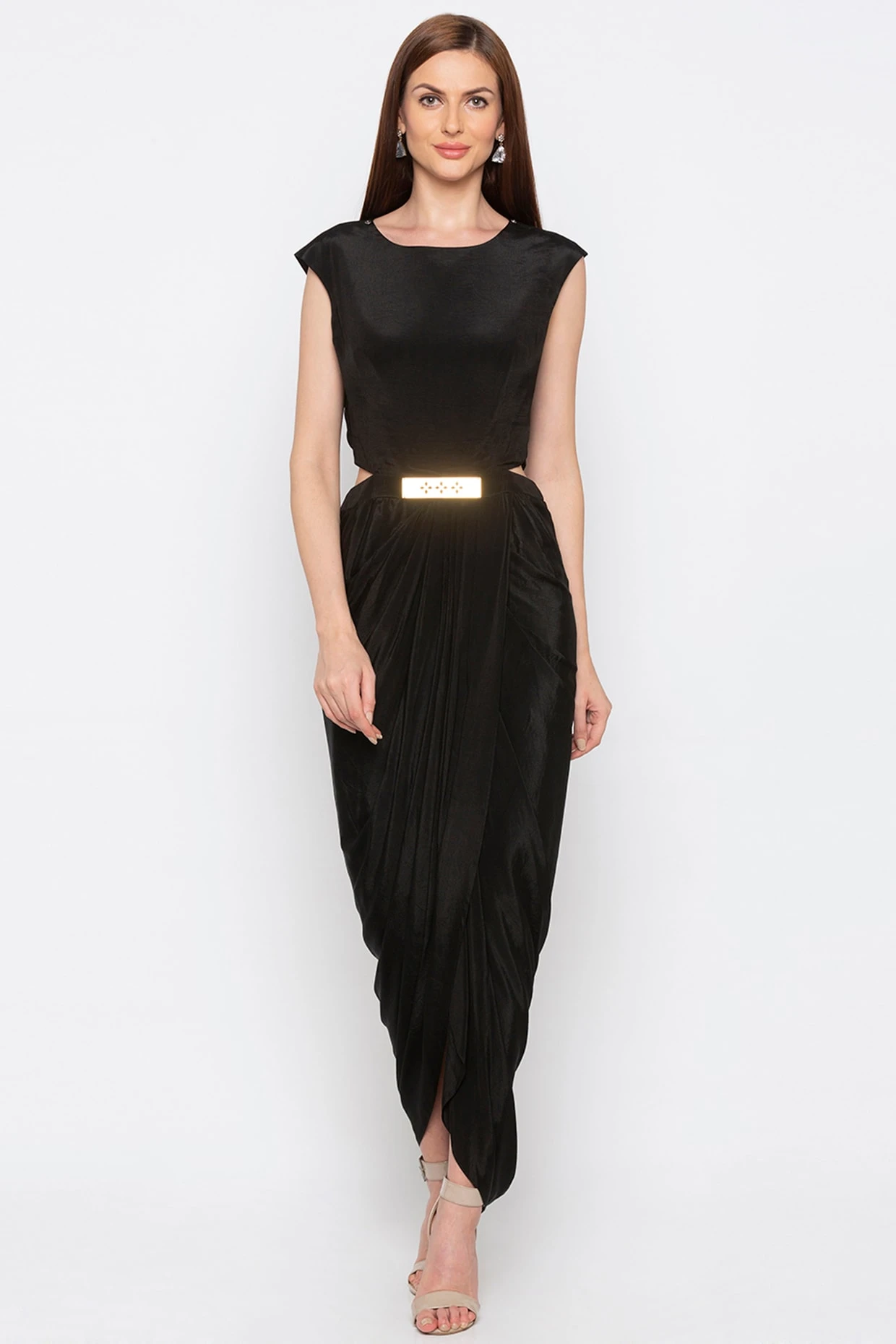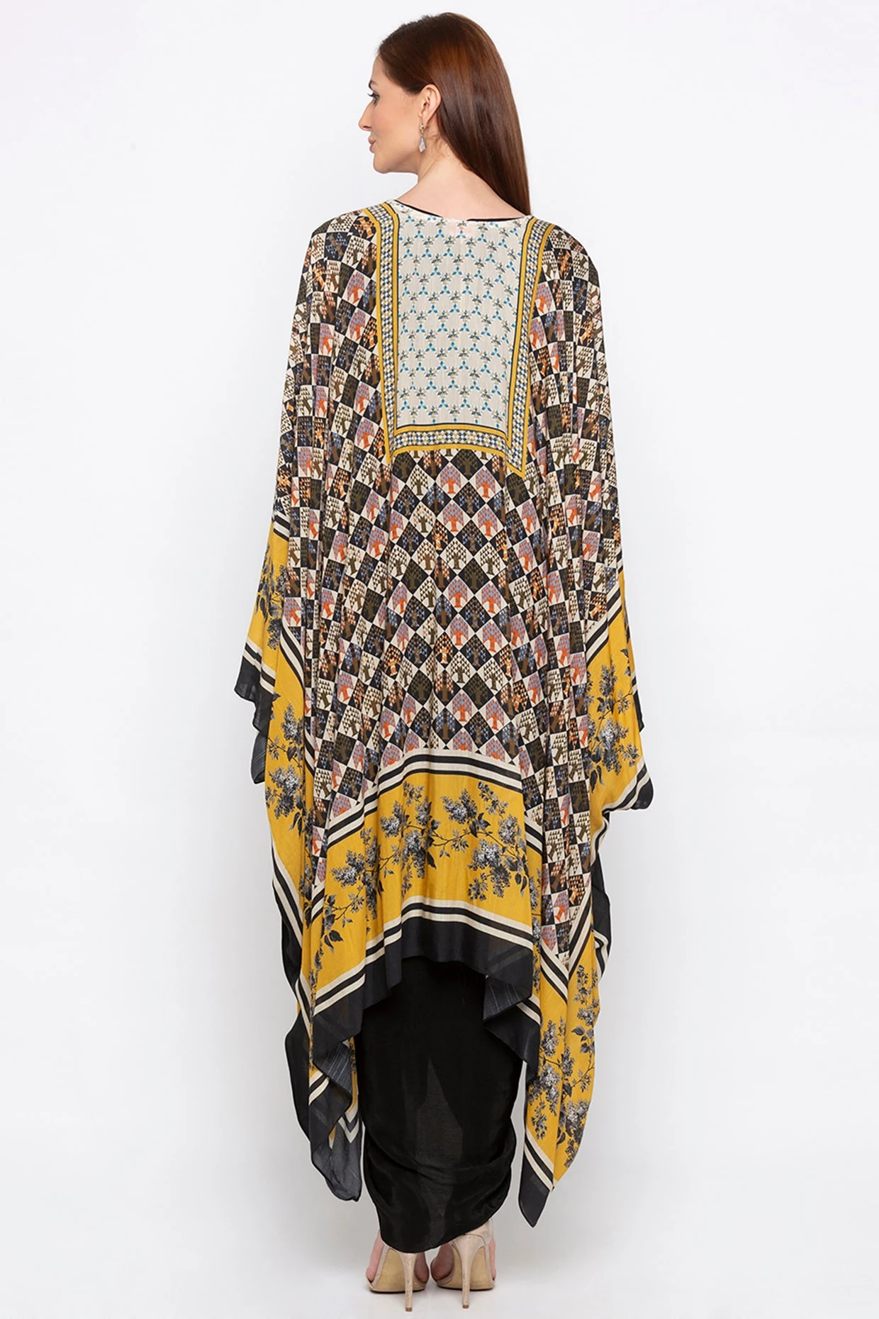 Featuring a yellow cape jacket in muslin slub base with prints. It is paired with a matching solid black dress in crepe base having metal buckle at the waist.