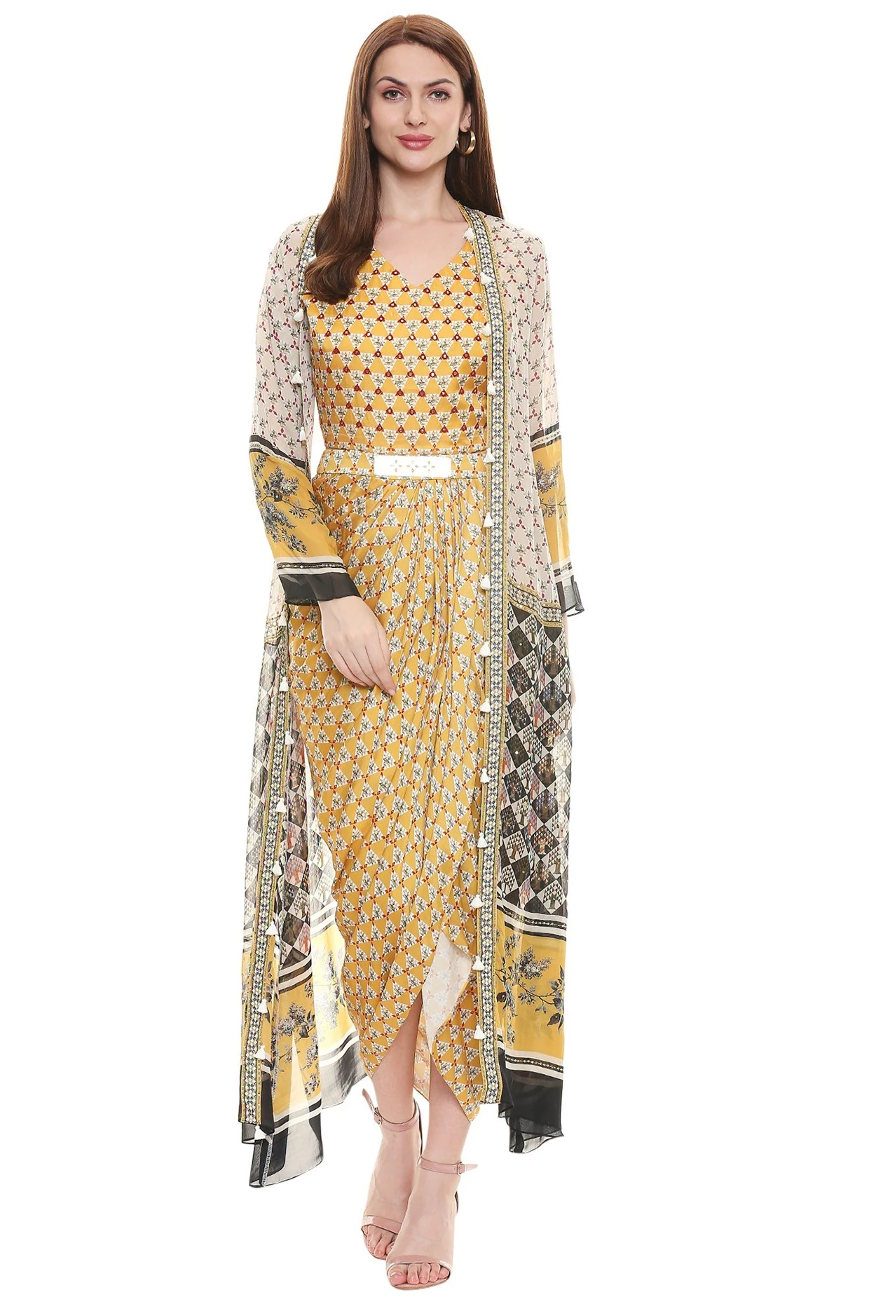 Featuring a yellow draped dress in satin and chiffon base with applique print. It is paired with a contrasting embellished jacket.