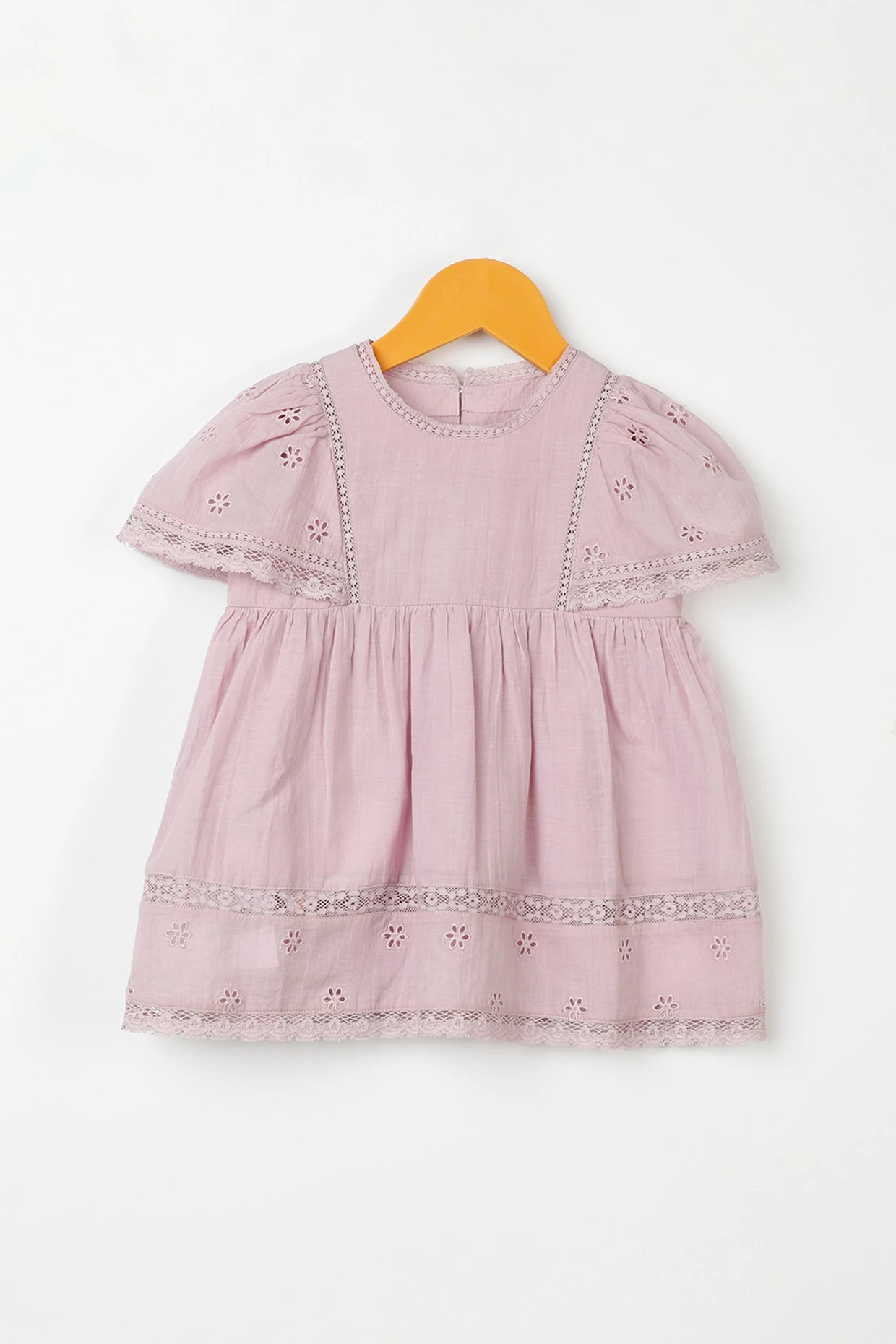 Featuring a lavender shift dress in organic cotton base with embroidery, ruffles, and lace detailing.