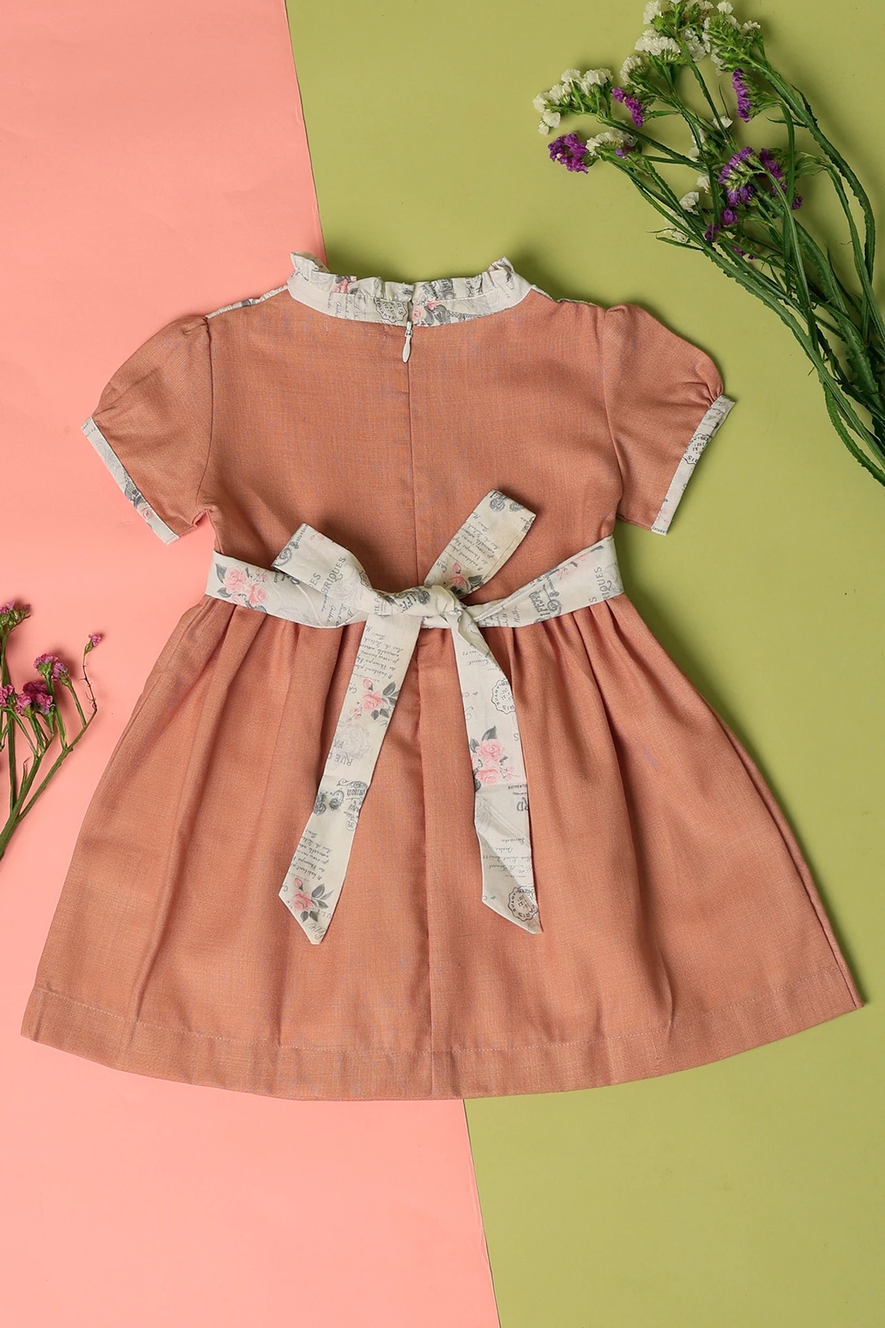 Featuring a white apron dress in cotton blend base with satin flower and lace embroidery, including print and a belt.