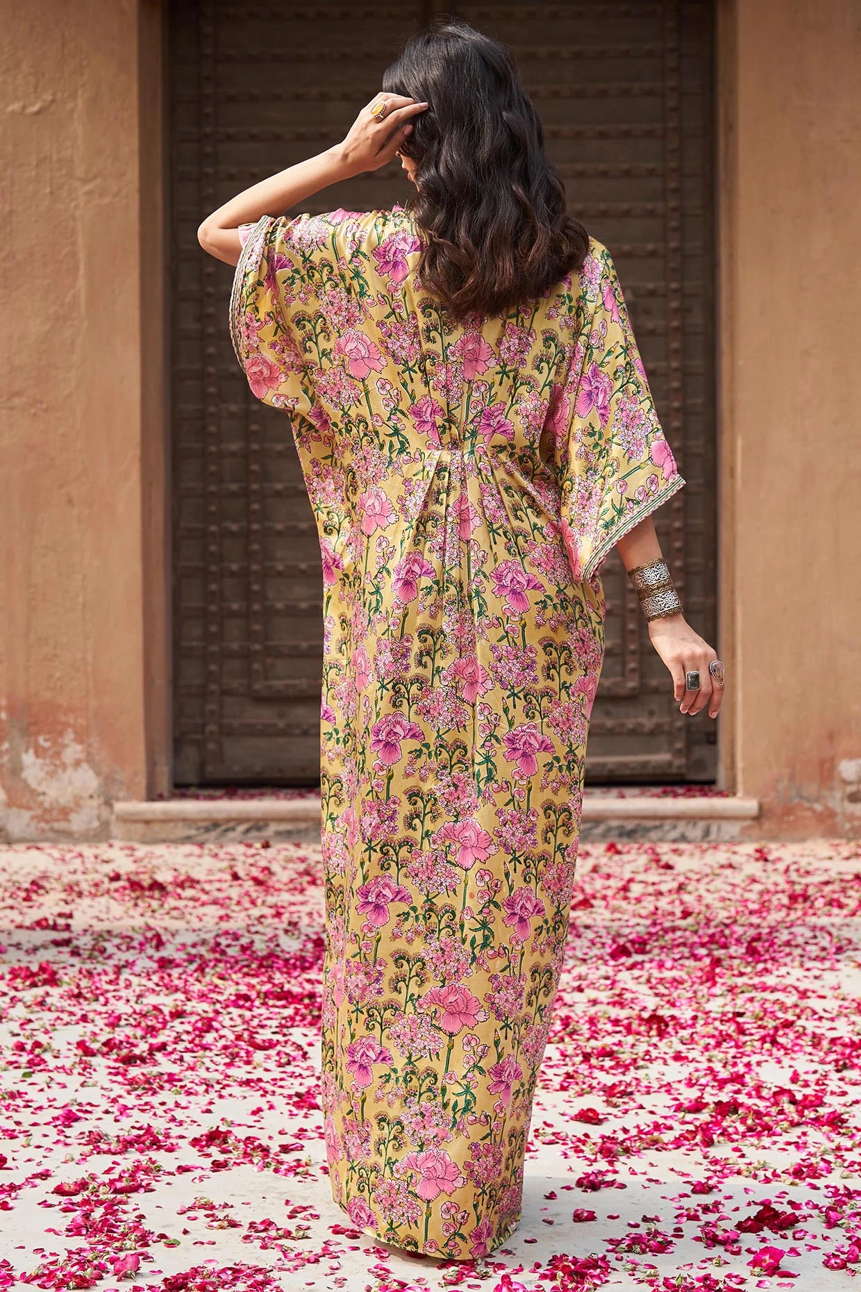 Featuring a yellow kaftan dress in modal satin base with handblock print, mirror embroidery, front pleats and side slits