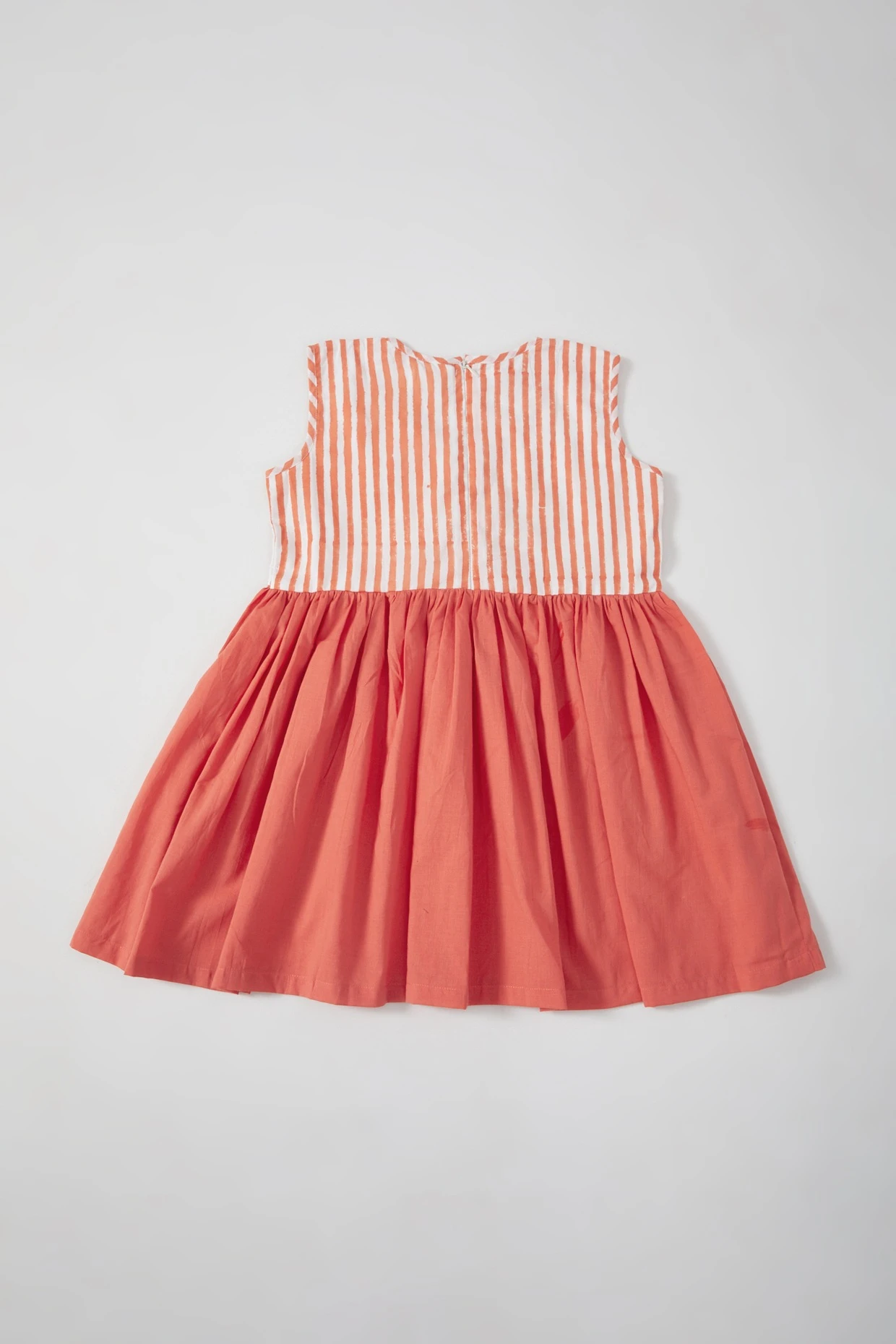 Featuring a georgia peach dress in cotton base with hand block printed stripes and a hand-made bow.
