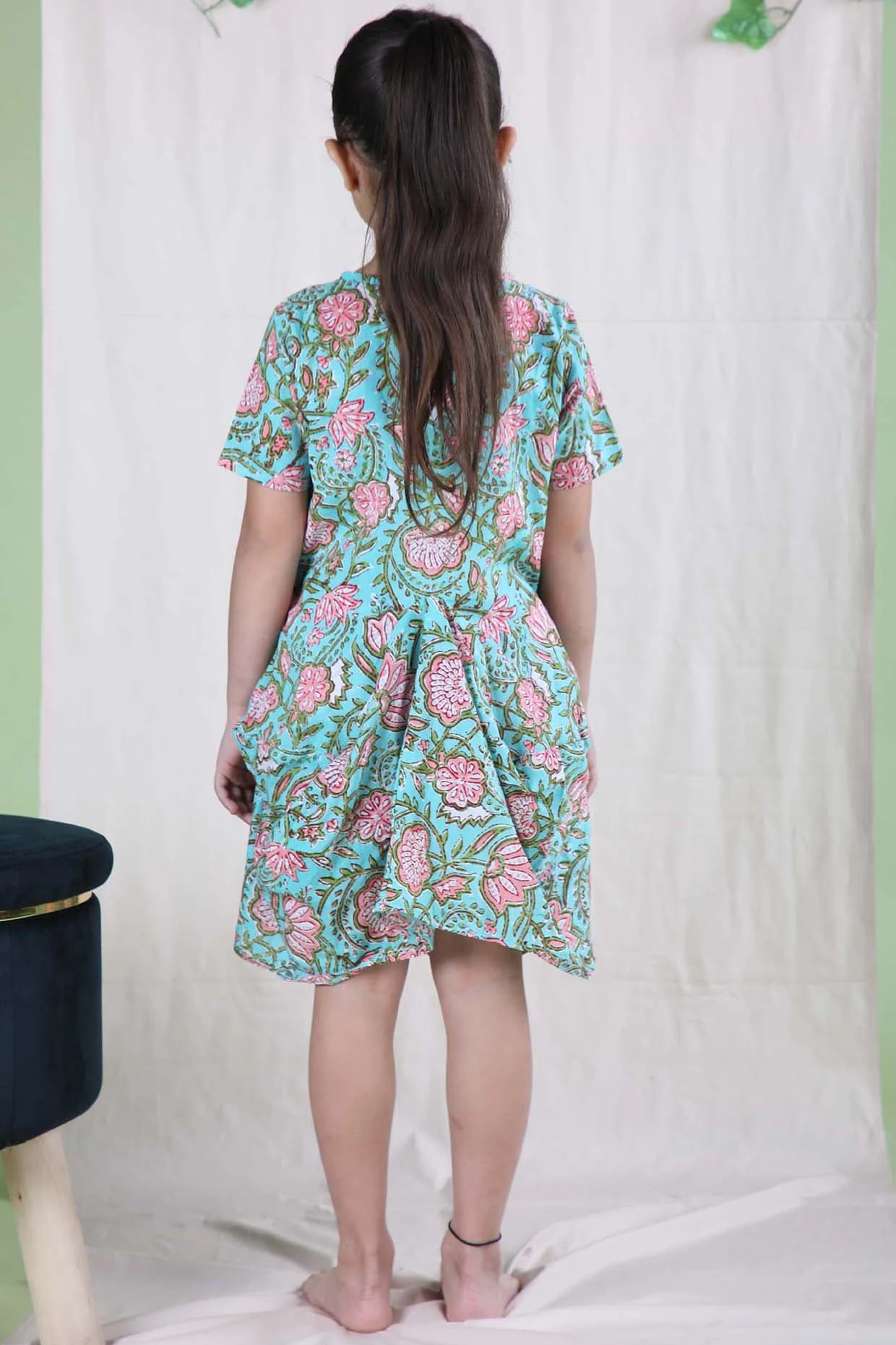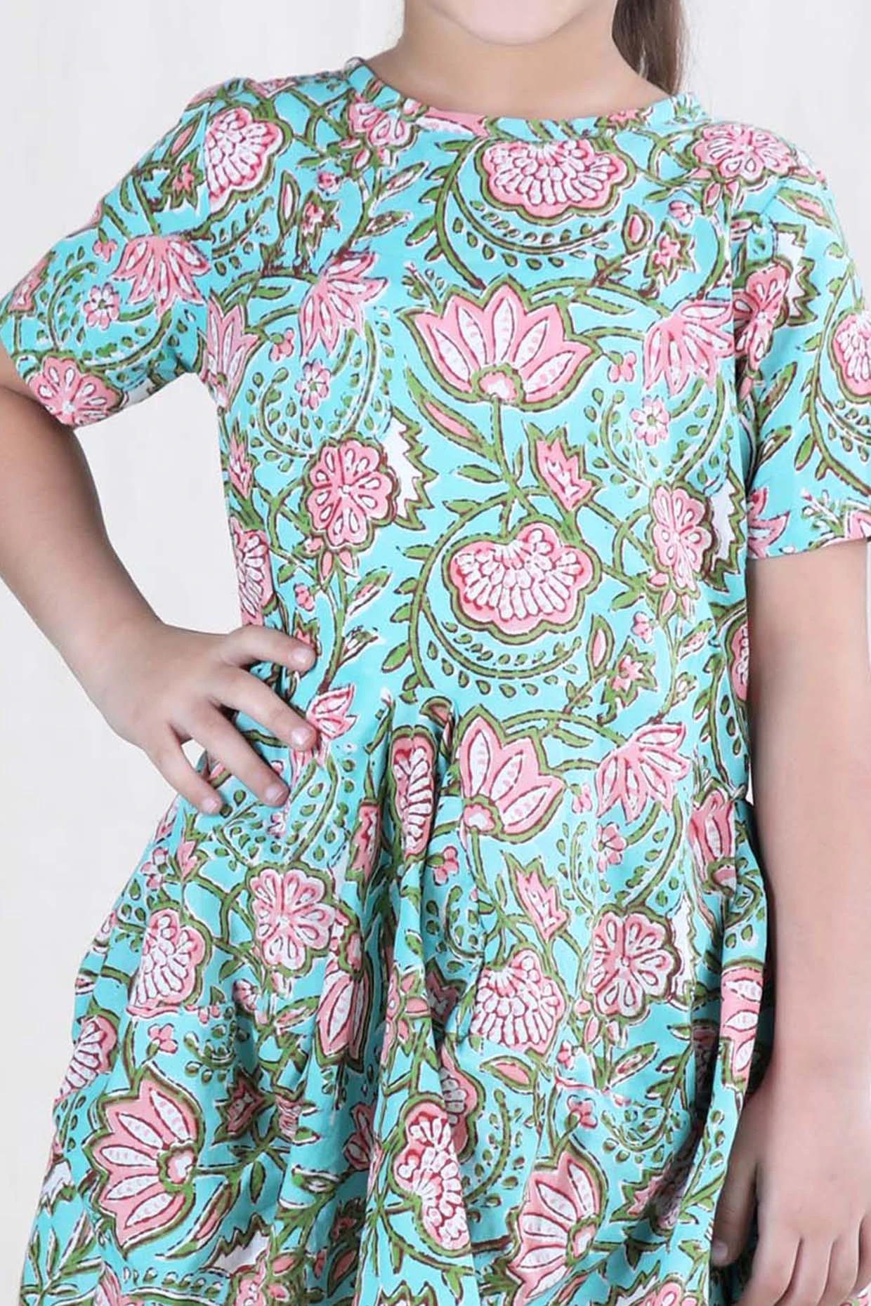 Featuring a mint dress in cotton lurex base with hand block print and cowl.