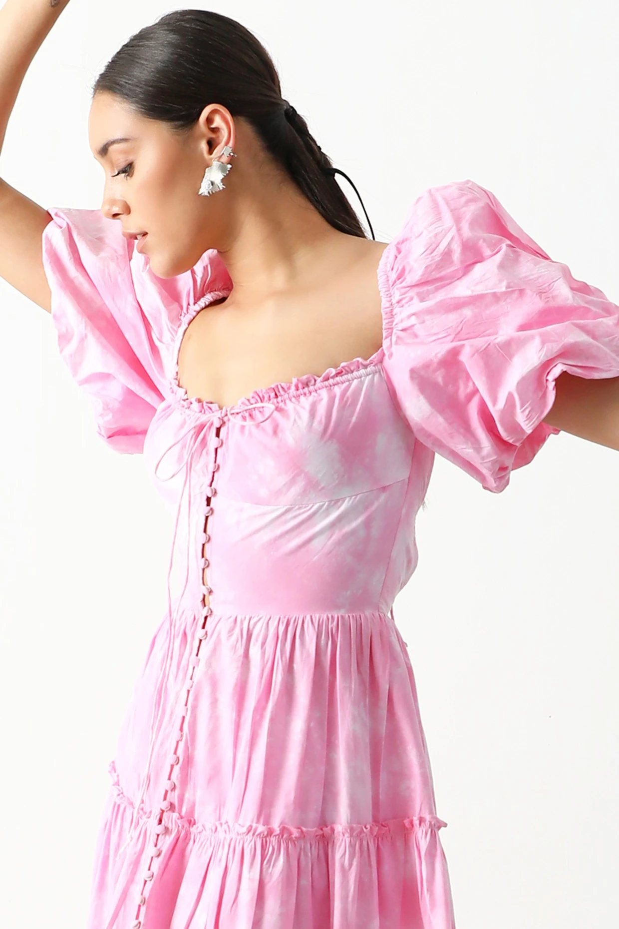 Featuring a bubblegum pink midi dress in paper cotton poplin base with balloon sleeves, string tie-up and tie-dye print.