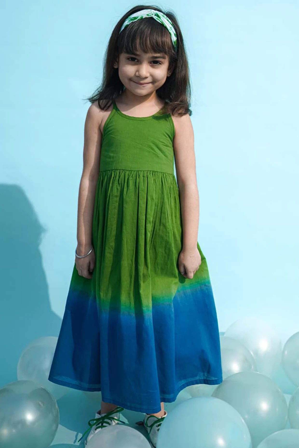 Featuring a green and blue ombre maxi dress in cotton base with tie-dye print.