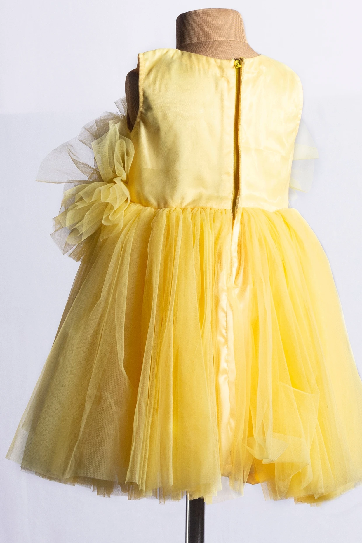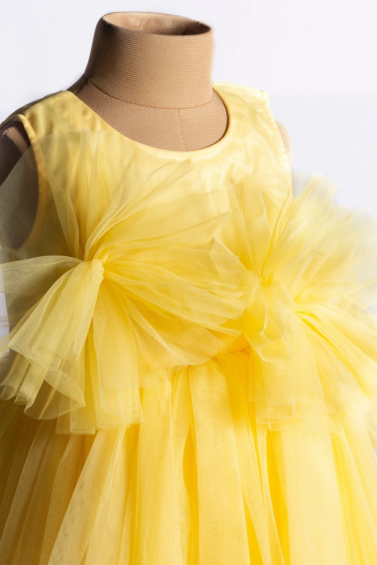 Featuring a yellow dress in net base with fluffy flowers.